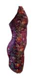 Floral dress with mandarin collar, and lace-up detail across center front to right side seam slit. Side seam has fabric tab covering.